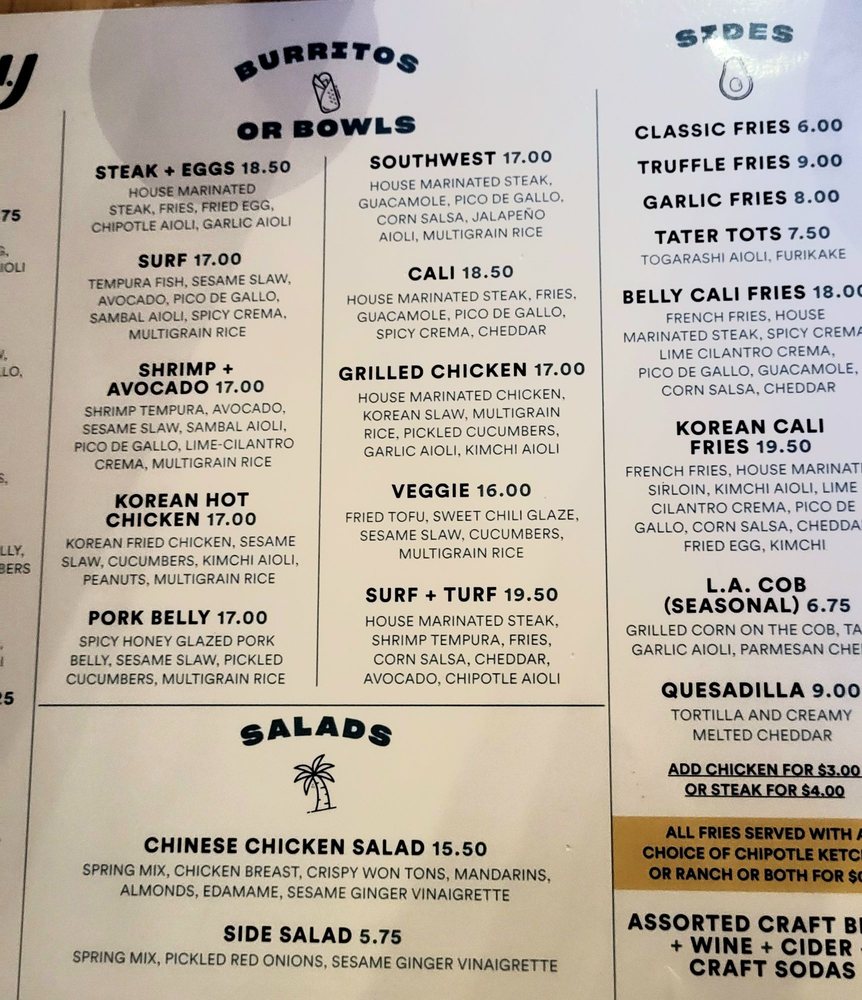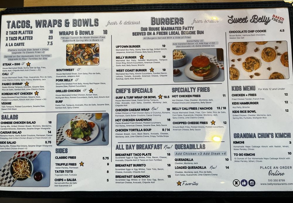 Belly, located in Oakland, CA, offers a unique fusion of Asian, burgers, and Mexican cuisine. With a menu featuring options like Grilled Chicken Tacos and Cali Burritos, this trendy spot caters to a variety of tastes. The restaurant prides itself on being vegan-friendly, offering compostable containers, and providing reusable tableware. Customers praise the flavorful dishes such as the Panko Shrimp Taco and Chopped Cheese Fries. The restaurant's cozy atmosphere and attentive service create a welcoming dining experience. Overall, Belly stands out for its creative dishes, sustainable practices, and diverse menu options, making it a must-visit for food enthusiasts looking for a delicious and socially responsible dining experience.